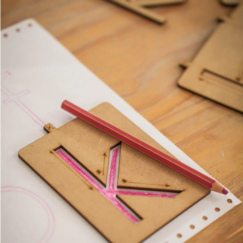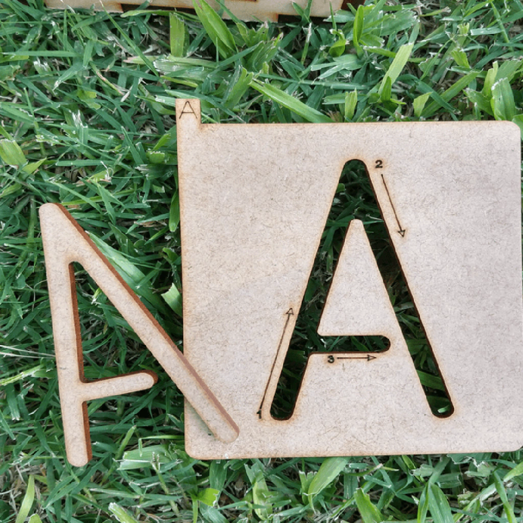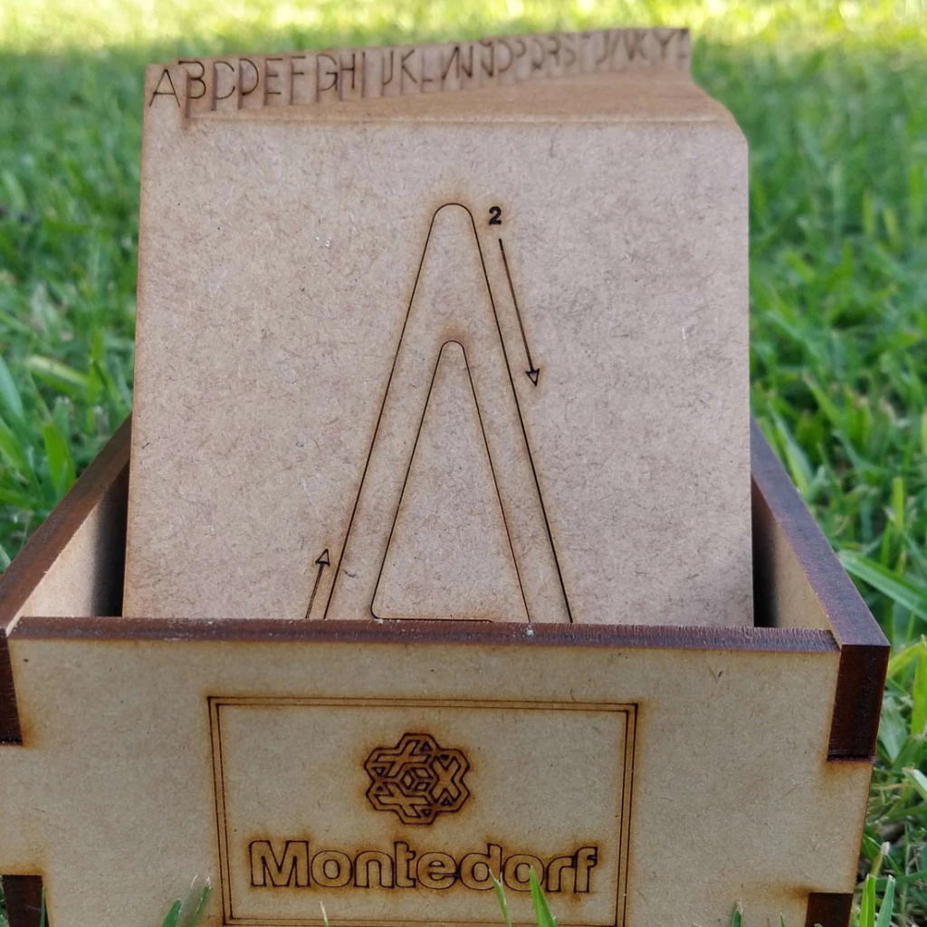 Consiste en una caja con tarjetas de letras imprenta mayúscula que son encastrables y trazables.
