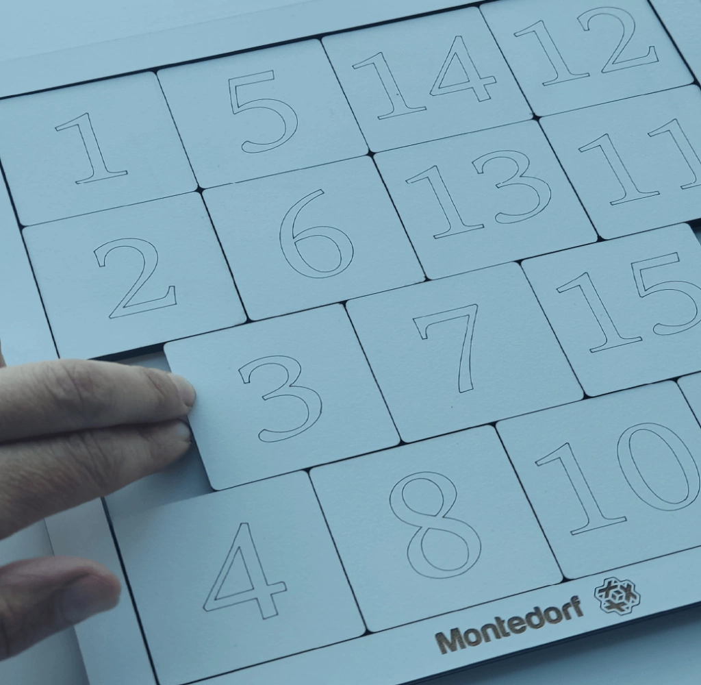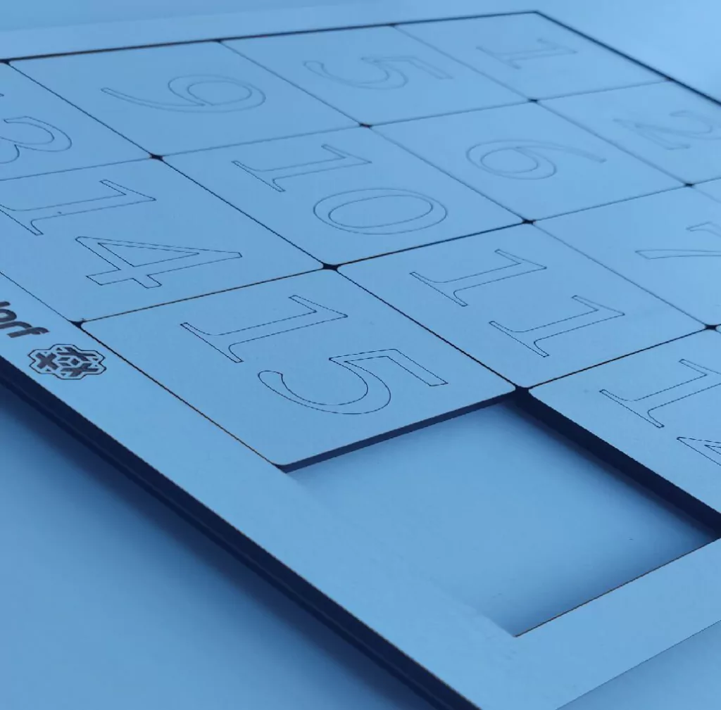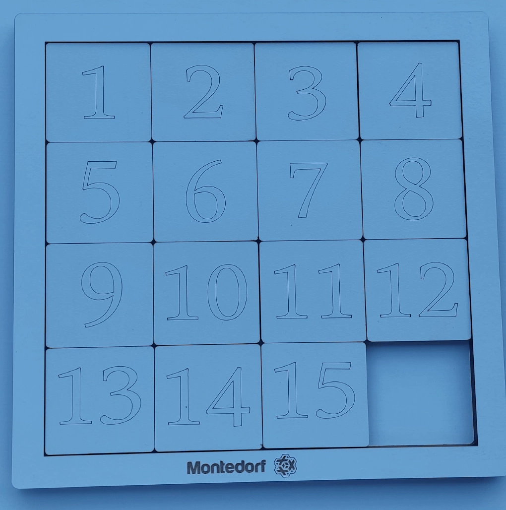 Es un tablero de 24 cm x 24 cm con 15 fichas (del 1 al 15) que se deben ordenar consecutivamente sin levantar las fichas; para ordenarlas hay que deslizarlas.